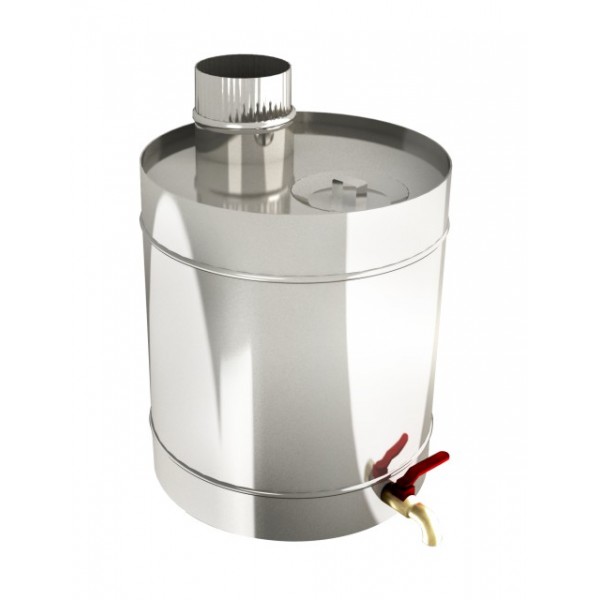 Данные баки относятся к навесным бакам и нагревают воду от температуры дымовых газов. Стенки дымохода быстро нагревают воду. Промежуток времени необходимый для подогрева новой порции воды после того, как в тазик слили всю горячую воду, довольно небольшой. За счет быстрого темпа нагрева воды даже бак небольшой емкости способен обеспечить потребность в горячей воде, например для того, чтобы помыть посуду. Так же приятно, когда и человеку в походных условиях можно тщательно помыться с горячей водой и мылом.