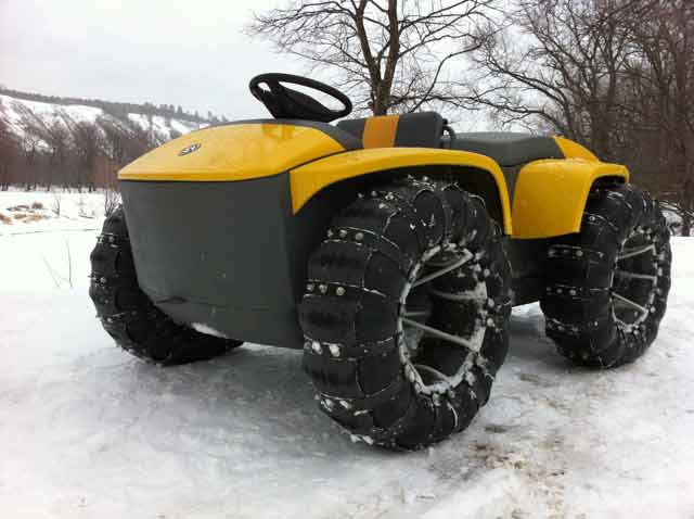 Пневмоход-амфибия на больших колесах низкого давления предназначен для перевозки рыбаков и охотников по межсезонной слякоти. Не следует считать его вездеходом, хотя он передвигается по снежной каше, пухляку (по колено), плавает за счет собственной плавучести и водомета. В другое время может быть поставлен на колеса от “НИВЫ” или другие и использован как малый сельский трактор. Для перевозки небольших грузов имеется шаровой кулак за который цепляется прицеп.