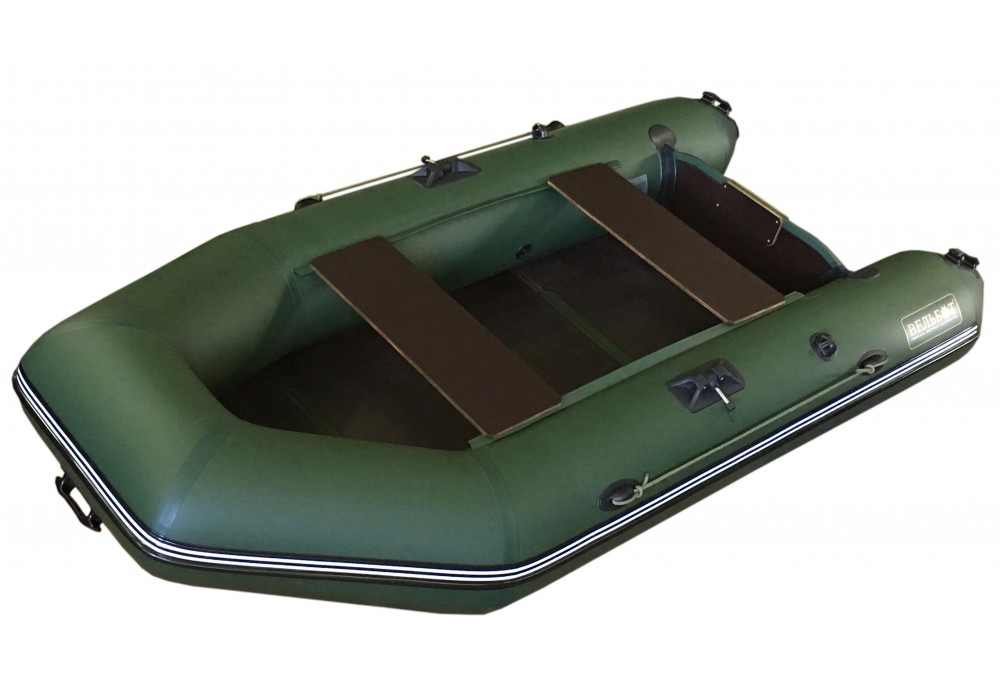слань-«книжка», изготовленная из 6мм водостойкой фанеры с антискользящим покрытием, два сиденья, два весла, двухстворчатый насос, сумка для переноски, ремонтный комплект.